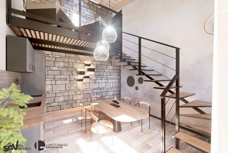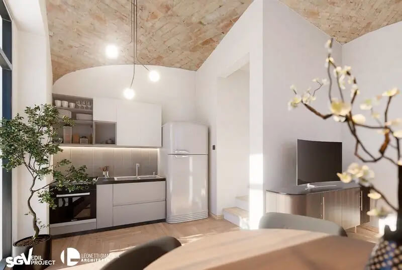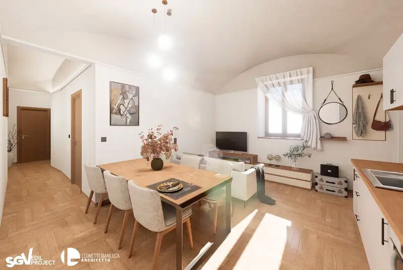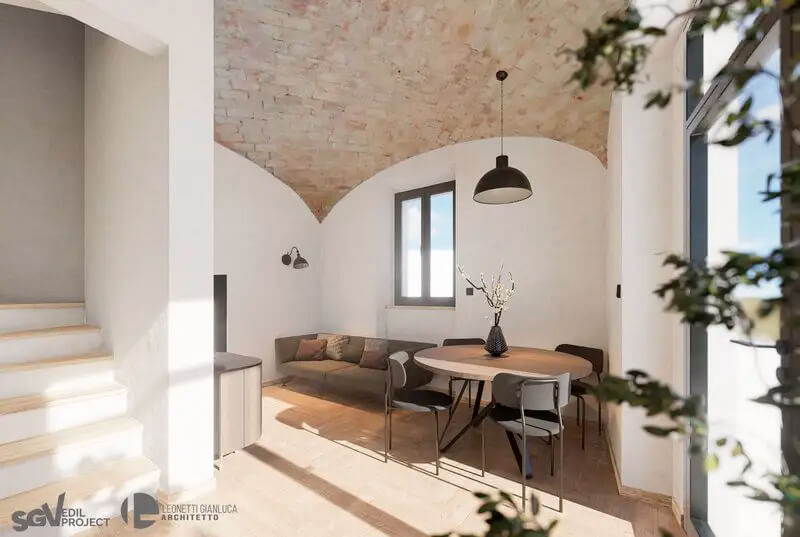 L'intervento restituisce valore a un edificio di pregio, preservandone i dettagli storici — volte a crociera in mattoni, muri in pietra a vista, strutture lignee — e integrandoli con finiture moderne di alta qualità: pavimenti effetto legno, bagni con rivestimenti pregiati, serramenti ad alta efficienza energetica e impianti di ultima generazione.